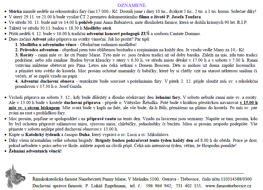 1. neděle adventní V neděli 27. listopadu slavíme 1. neděli adventní. Prohlédněte si pořad bohoslužeb a ohlášky. Previous postSlavnost Ježíše Krista Krále Next postPožehnání nové fary 3. prosince 2016 Komentáře nejsou povoleny.