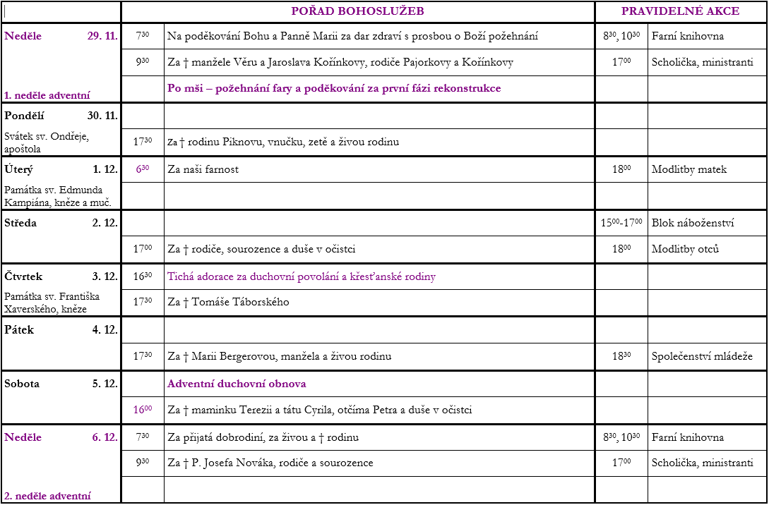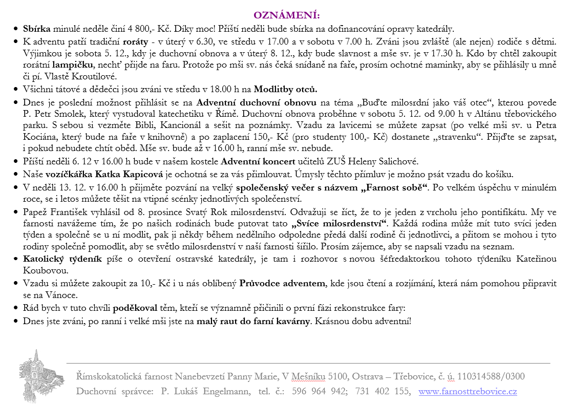 V neděli 29. listopadu slavíme 1. neděli adventní. Prohlédněte si pořad bohoslužeb a ohlášky.