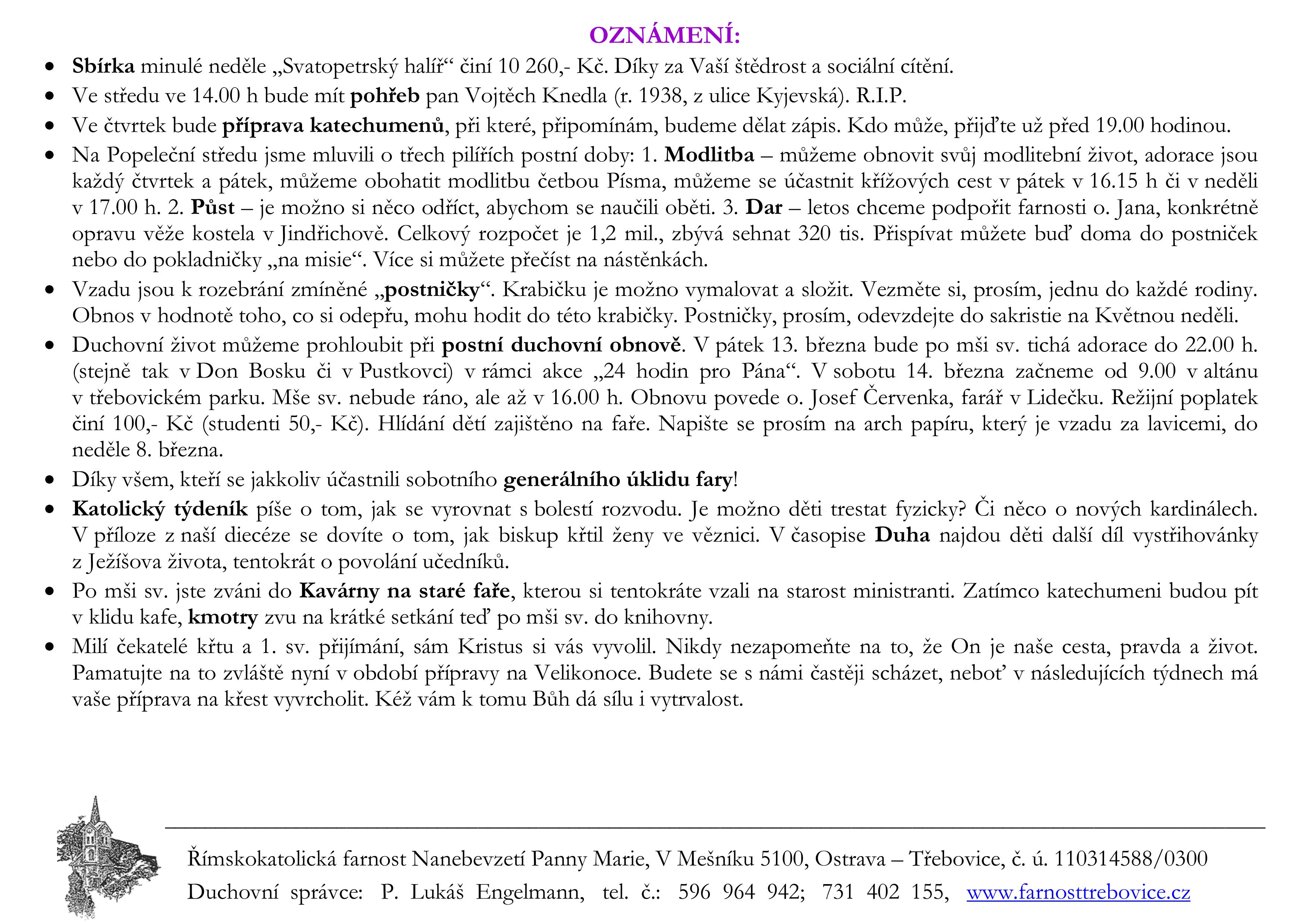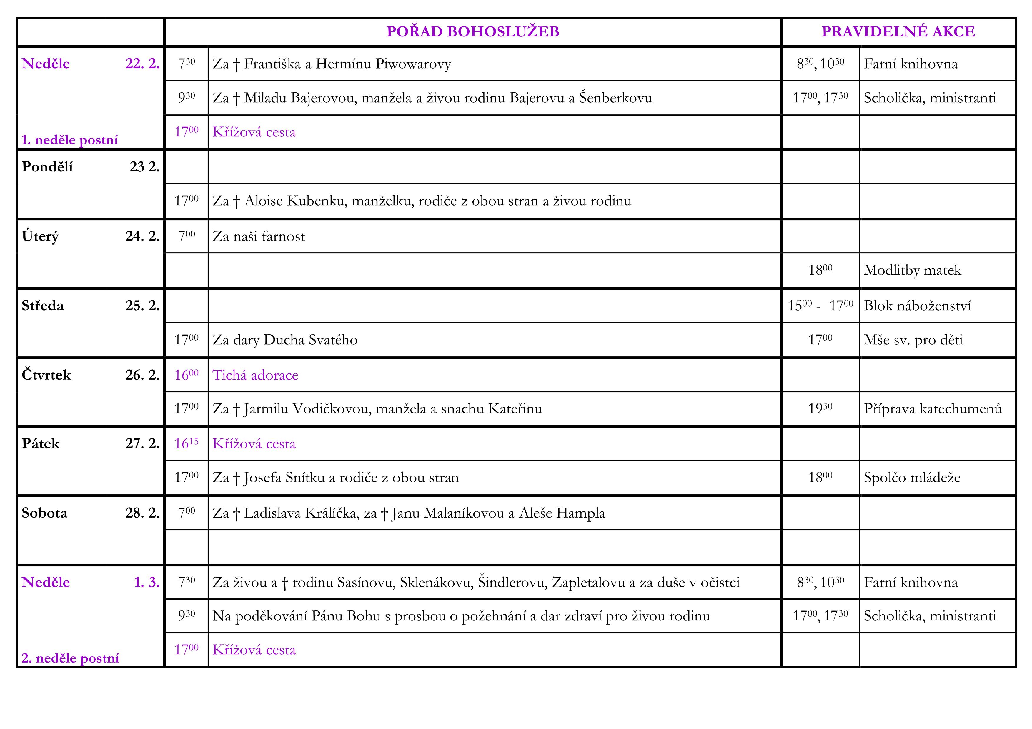 V neděli 22. února slavíme 1. neděli postní. Prohlédněte si pořad bohoslužeb a ohlášky.