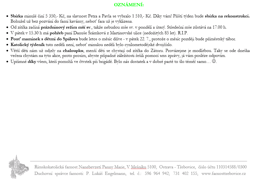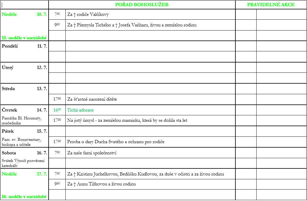 V neděli 10. července slavíme 15. neděli v mezidobí. Prohlédněte si pořad bohoslužeb a ohlášky.