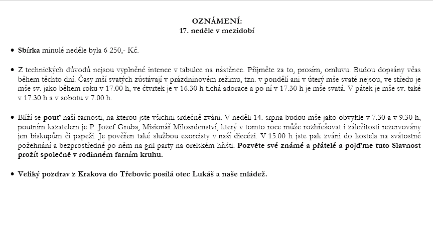 V neděli 24. července slavíme 17. neděli v mezidobí. Prohlédněte si pořad bohoslužeb a ohlášky.