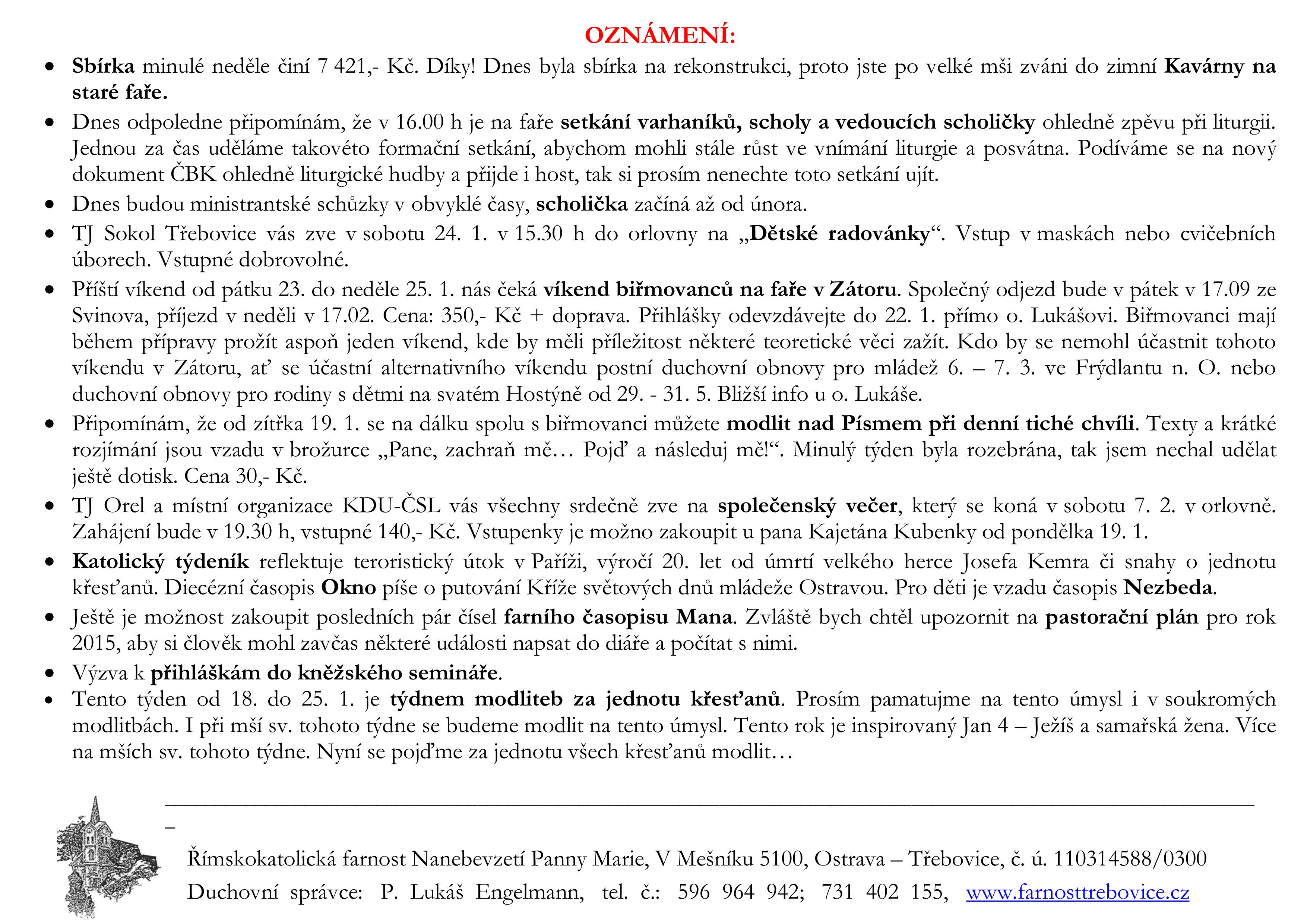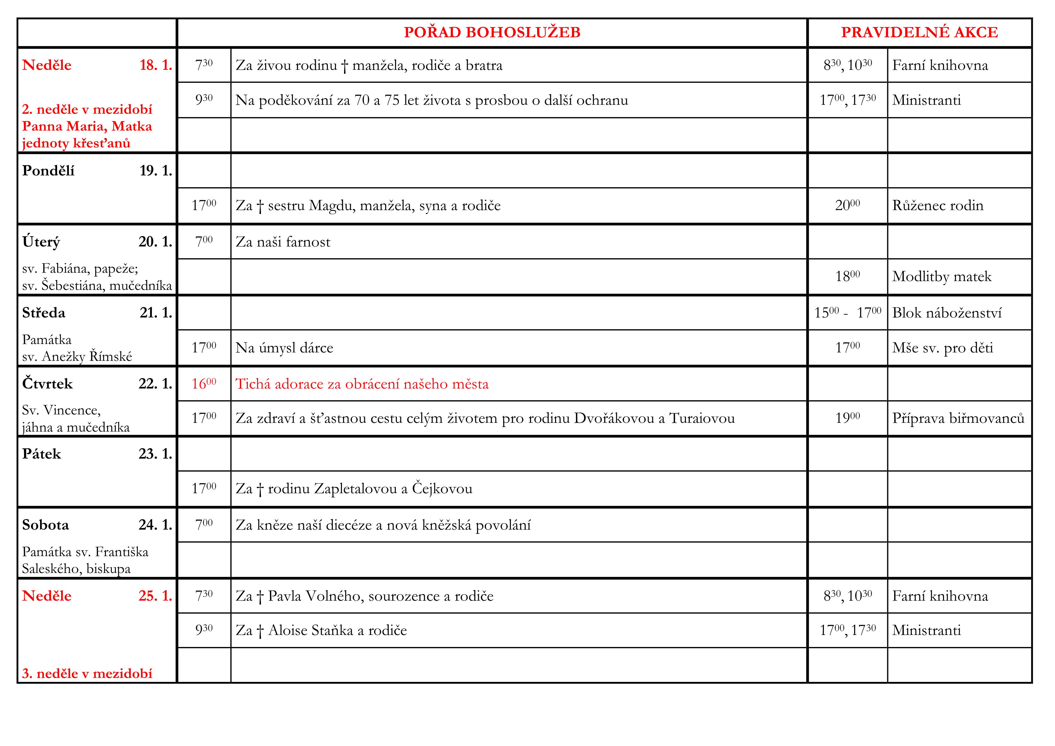 2. neděle v mezidobí (Panna Maria, Matka jednoty křesťanů) V neděli 18. ledna slavíme 2. neděli v mezidobí. Prohlédněte si pořad bohoslužeb a ohlášky. Previous postSvátek Křtu Páně Next postNové rozpisy úklidu fary a kostela Komentáře nejsou povoleny.