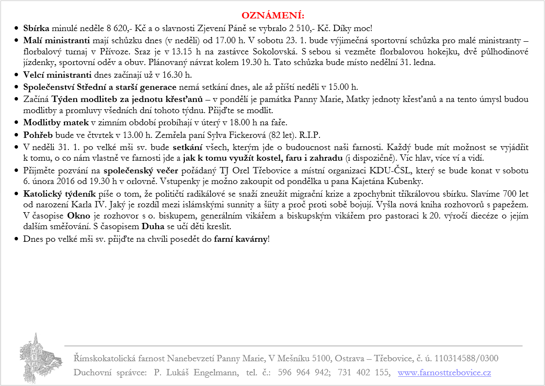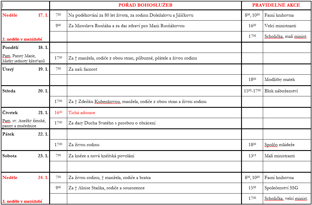 2. Neděle v mezidobí V neděli 17. ledna slavíme 2. neděli v mezidobí. Prohlédněte si pořad bohoslužeb a ohlášky. Previous postSvátek Křtu Páně Next post3. Neděle v mezidobí Komentáře nejsou povoleny.