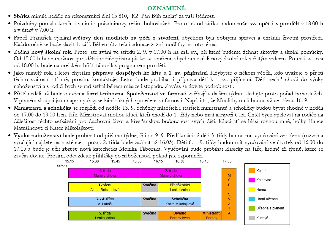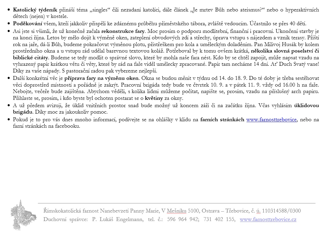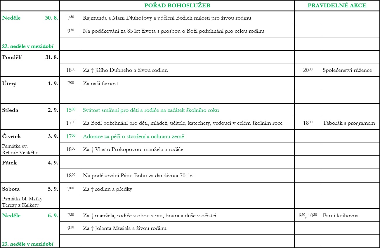 V neděli 30. srpna slavíme 22. neděli v mezidobí. Prohlédněte si pořad bohoslužeb a ohlášky.