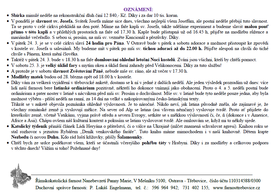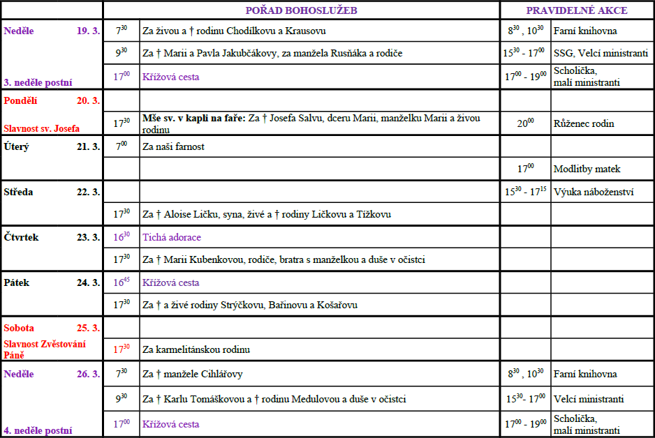 Ohlášky 3. neděle postní V neděli 19. března slavíme 3. neděli postní. Prohlédněte si pořad bohoslužeb a ohlášky. Previous postOhlášky 2. neděle postní Next postOhlášky 4. neděle postní Komentáře nejsou povoleny.