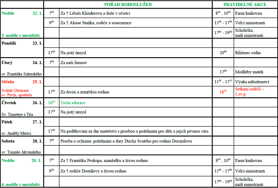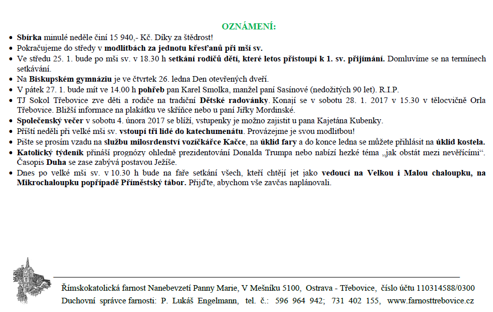 3. neděle v mezidobí V neděli 22. ledna slavíme 3. neděli v mezidobí. Prohlédněte si pořad bohoslužeb a ohlášky. Previous postPřímluvné modlitby čtvrtek 19. 1. 2017 Next post4. neděle v mezidobí Komentáře nejsou povoleny.