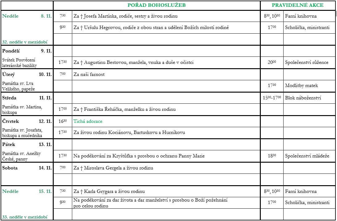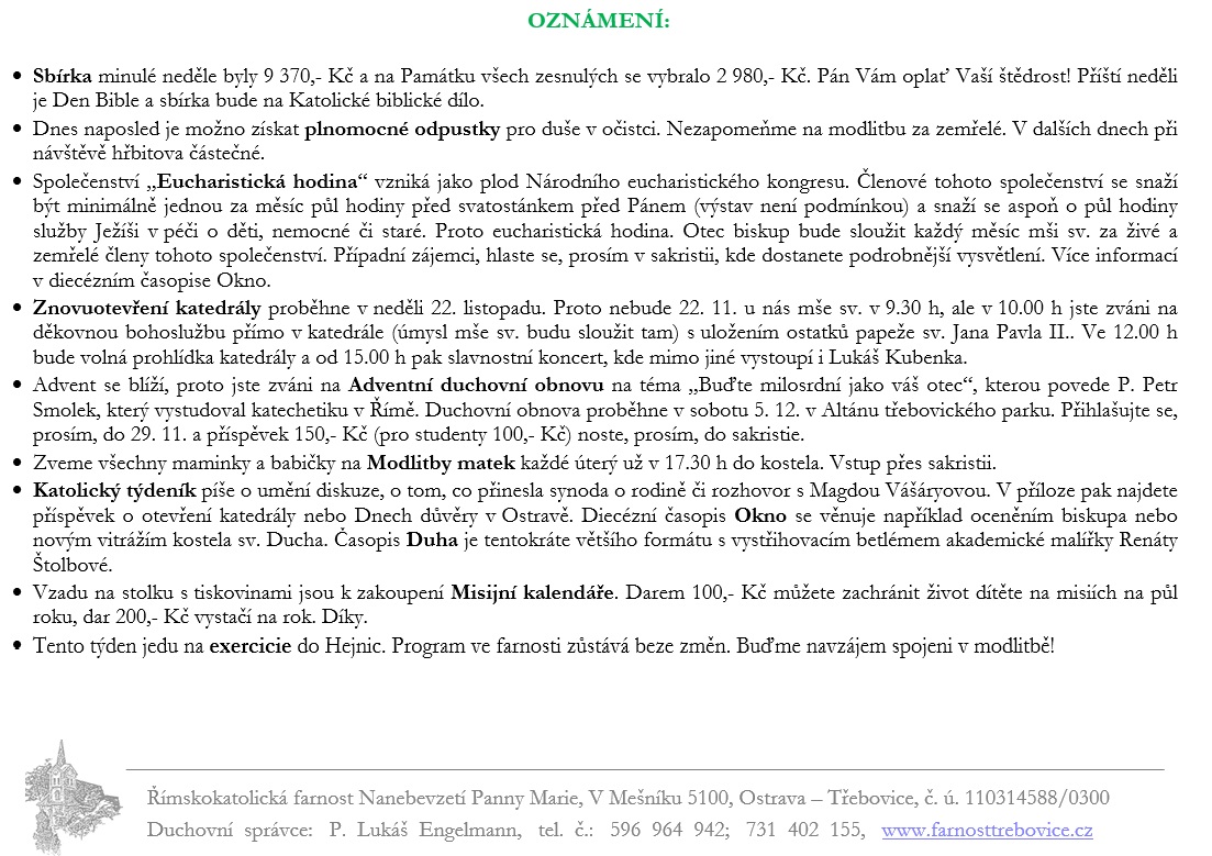 32. neděle v mezidobí V neděli 8. listopadu slavíme 32. neděli v mezidobí. Prohlédněte si pořad bohoslužeb a ohlášky. Previous postSlavnost Všech Svatých Next postAdventní duchovní obnova Komentáře nejsou povoleny.