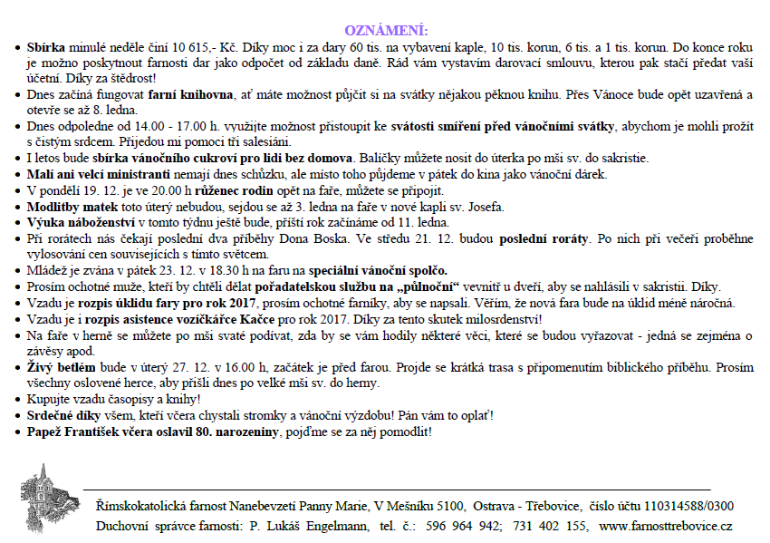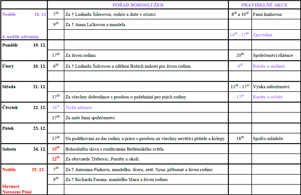 4. neděle adventní V neděli 18. prosince slavíme 4. neděli adventní. Prohlédněte si pořad bohoslužeb a ohlášky. Previous post3. neděle adventní Next post1. neděle vánoční Komentáře nejsou povoleny.