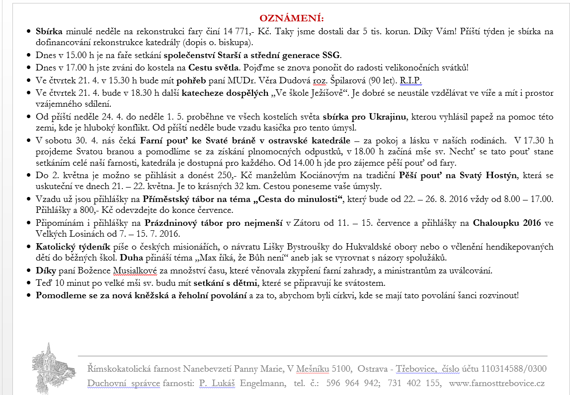V neděli 17. dubna slavíme 4. neděli velikonoční Dobrého pastýře. Prohlédněte si pořad bohoslužeb a ohlášky.