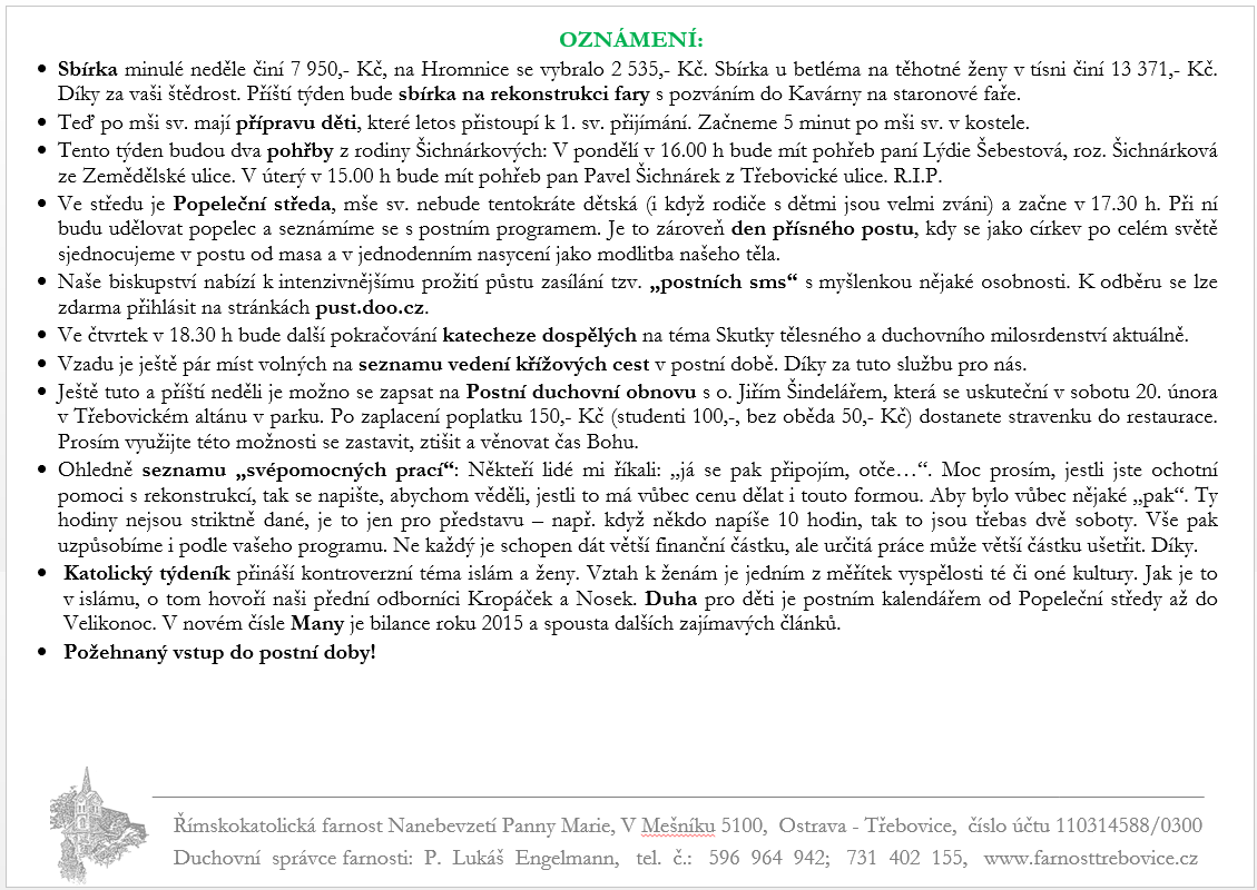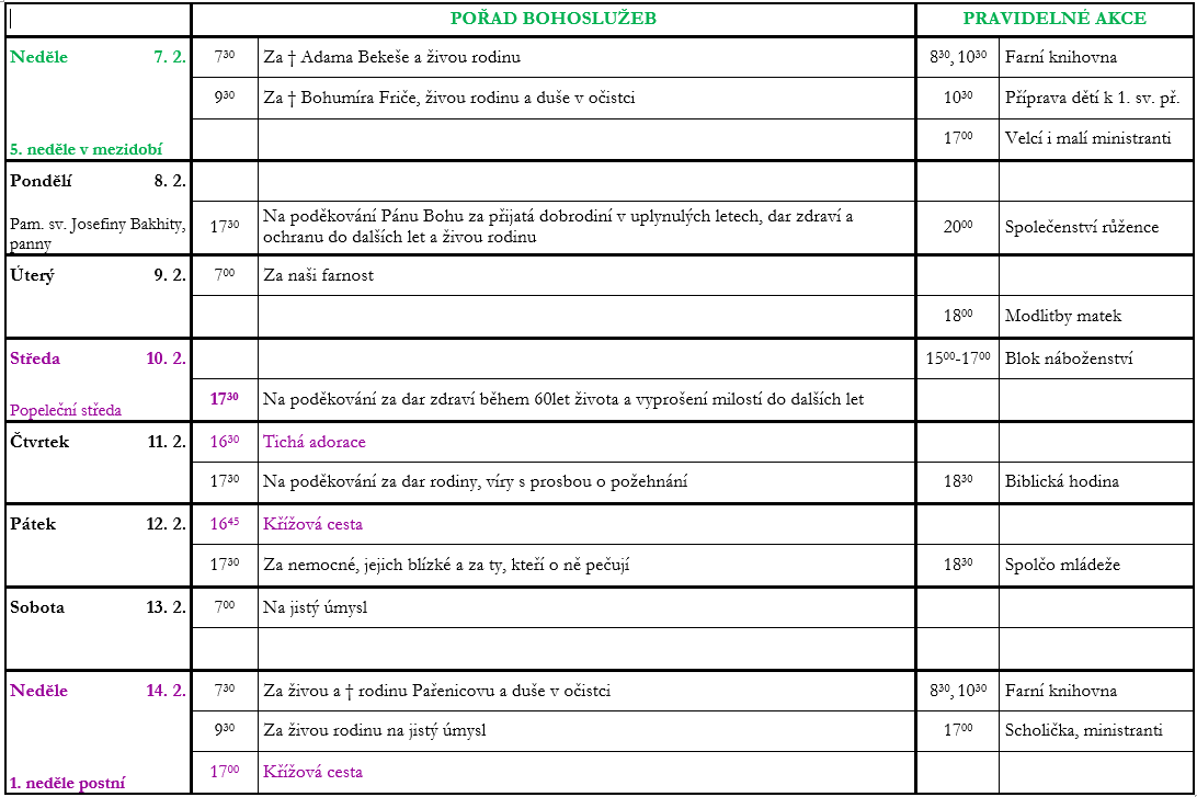 5. Neděle v mezidobí V neděli 7. února slavíme 5. neděli v mezidobí. Prohlédněte si pořad bohoslužeb a ohlášky. Previous postPostní duchovní obnova Next post1. Neděle postní Komentáře nejsou povoleny.