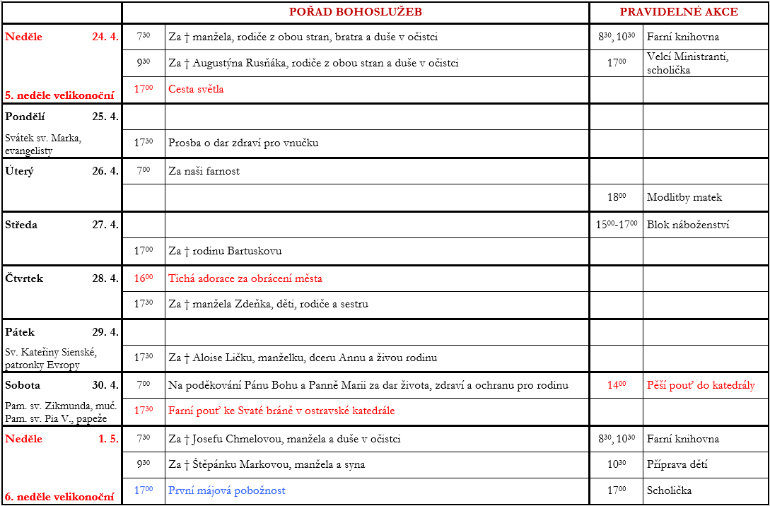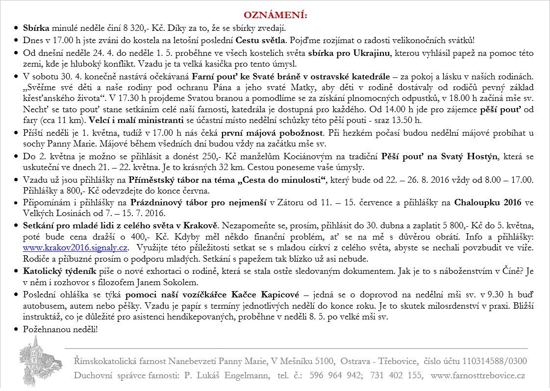5. neděle velikonoční neděle V neděli 24. dubna slavíme 5. neděli velikonoční. Prohlédněte si pořad bohoslužeb a ohlášky. Previous postPříměstský tábor 2016 Next post6. neděle velikonoční neděle Komentáře nejsou povoleny.