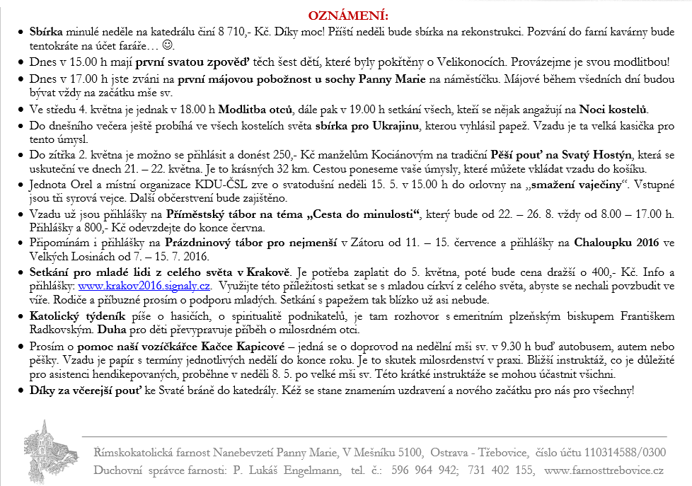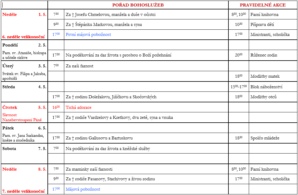 V neděli 1. května slavíme 6. neděli velikonoční. Prohlédněte si pořad bohoslužeb a ohlášky.