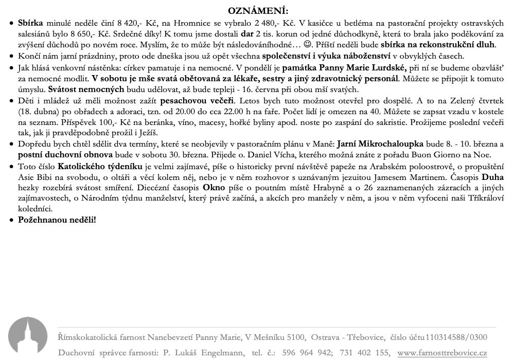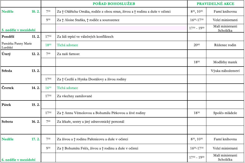 Aktuality k 10. únoru V neděli 10. února slavíme 5. neděli v mezidobí. Prohlédněte si pořad bohoslužeb a ohlášky. Previous postAktuality k 3. únoru Next postAktuality k 17. únoru Komentáře nejsou povoleny.