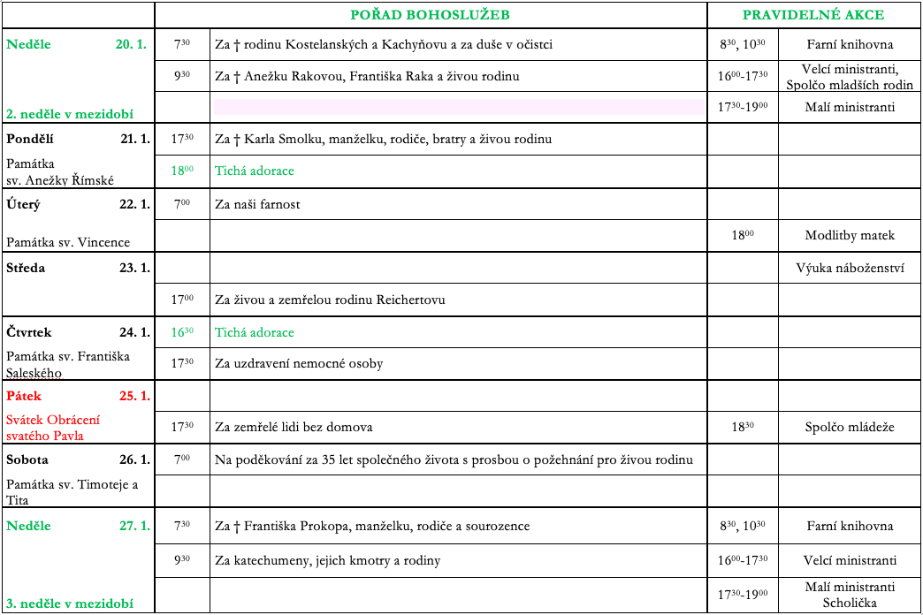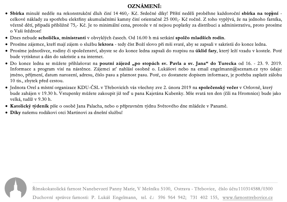 Aktuality k 20. lednu V neděli 20. ledna slavíme 2. neděli v mezidobí. Prohlédněte si pořad bohoslužeb a ohlášky. Previous postAktuality k 13. lednu Next postAktuality k 27. lednu Komentáře nejsou povoleny.