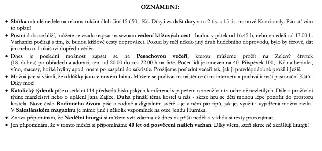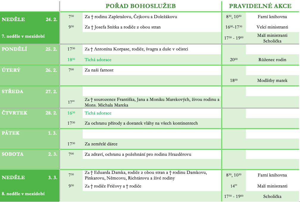 V neděli 24. února slavíme 7. neděli v mezidobí. Prohlédněte si pořad bohoslužeb a ohlášky.