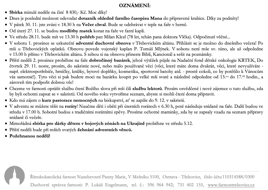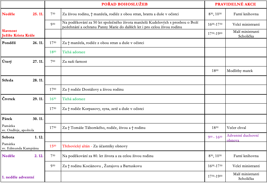 V neděli 25. listopadu slavíme Slavnost Ježíše Krista Krále. Prohlédněte si pořad bohoslužeb a ohlášky.