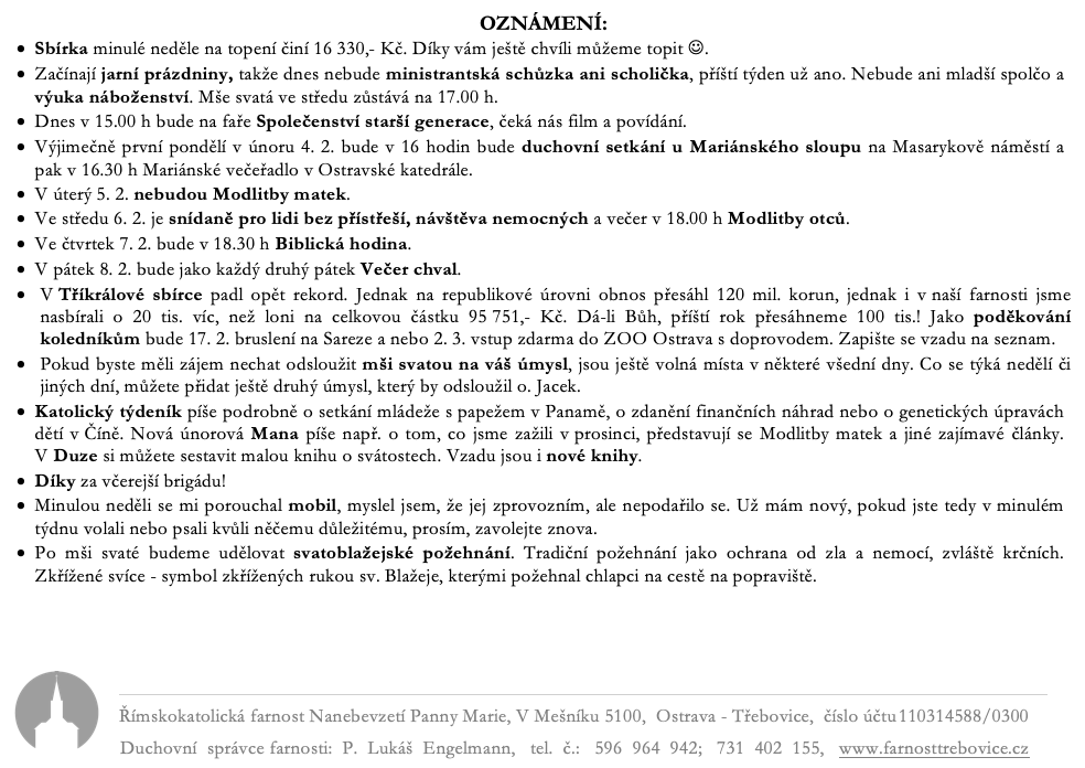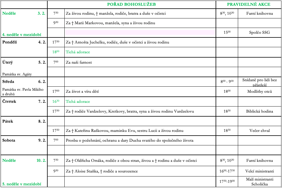 Aktuality k 3. únoru V neděli 3. února slavíme 4. neděli v mezidobí. Prohlédněte si pořad bohoslužeb a ohlášky. Previous postAktuality k 27. lednu Next postAktuality k 10. únoru Komentáře nejsou povoleny.