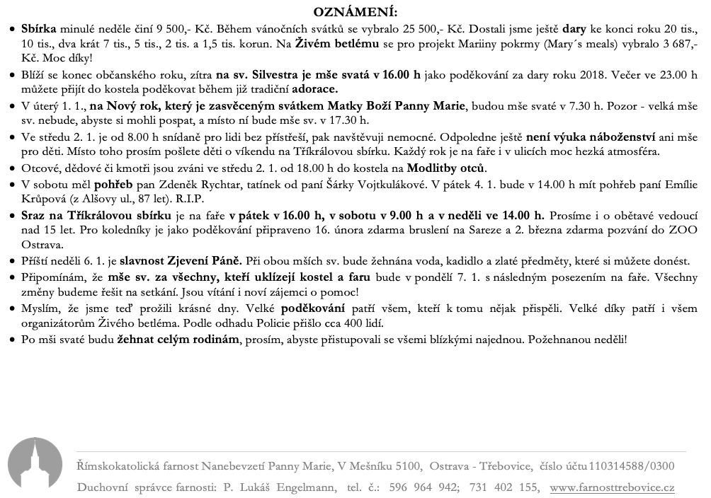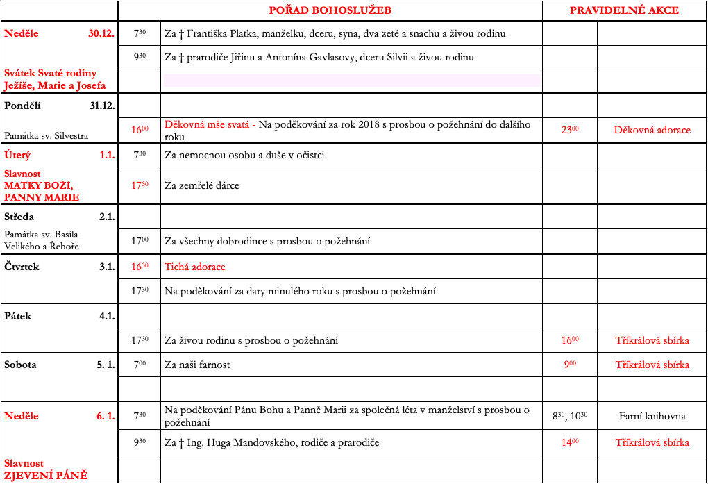 Aktuality ke 30. prosinci V neděli 30. prosince slavíme Svátek Svaté rodiny. Prohlédněte si pořad bohoslužeb a ohlášky. Previous postAktuality ke 23. prosinci Next postAktuality k 6. lednu Komentáře nejsou povoleny.