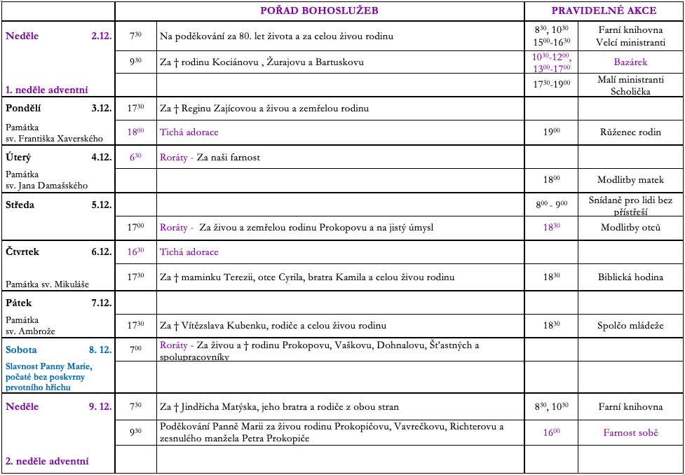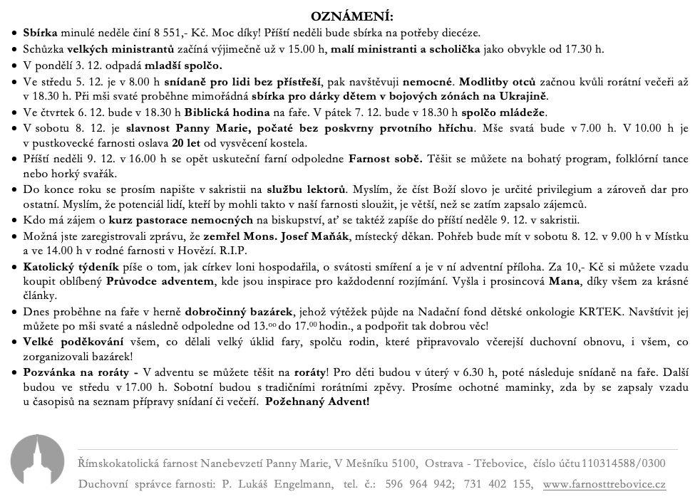 V neděli 2. prosince slavíme 1. neděli adventní. Prohlédněte si pořad bohoslužeb a ohlášky.