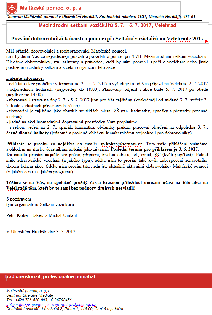 Milí přátelé, milí velehradští maltézští dobrovolníci.