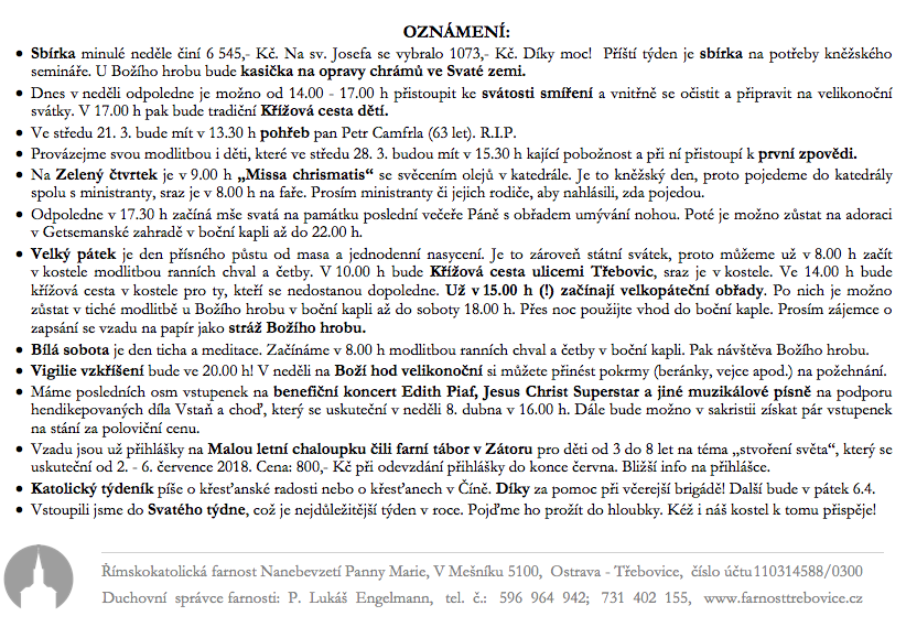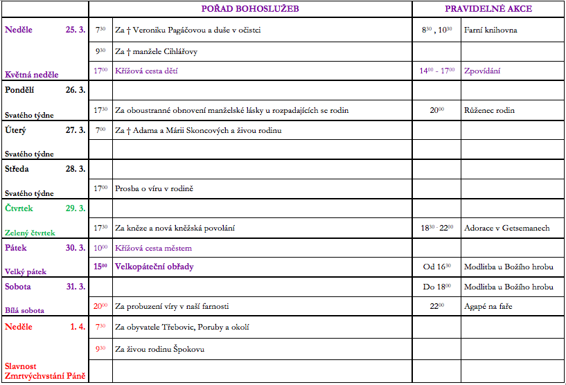 Ohlášky Květné neděle V neděli 25. března slavíme Květnou neděli. Prohlédněte si pořad bohoslužeb a ohlášky. Previous postPořad bohoslužeb o Velikonocích Next postOhlášky Slavnosti Zmrtvýchvstání Páně Komentáře nejsou povoleny.