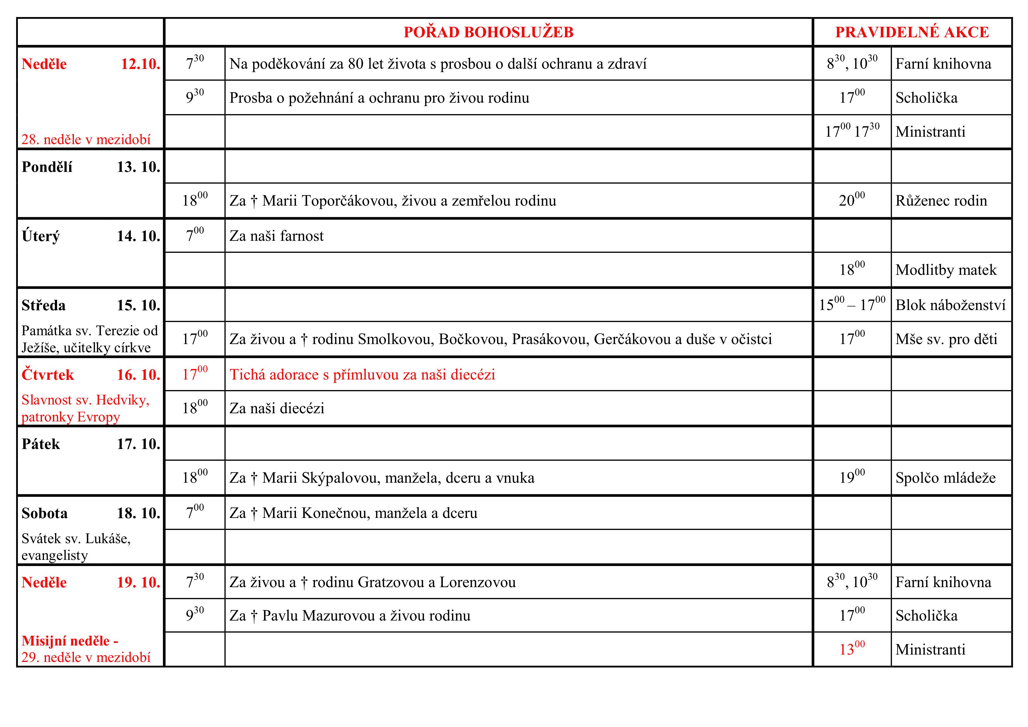 Neděle 12. října – pořad bohoslužeb a ohlášky