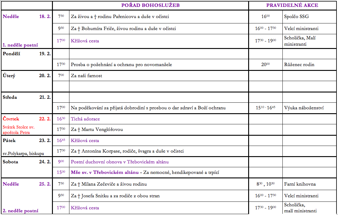 Ohlášky 1. neděle postní V neděli 18. února slavíme 1. neděli postní. Prohlédněte si pořad bohoslužeb a ohlášky. Previous postOhlášky 6. neděle v mezidobí Next postOhlášky 2. neděle postní Komentáře nejsou povoleny.