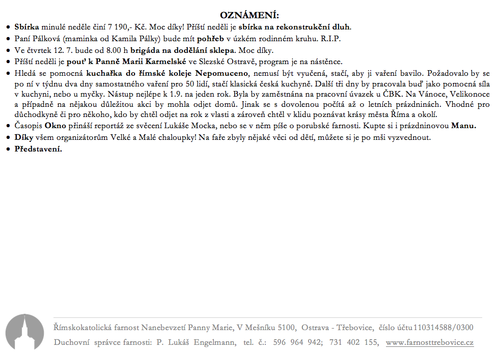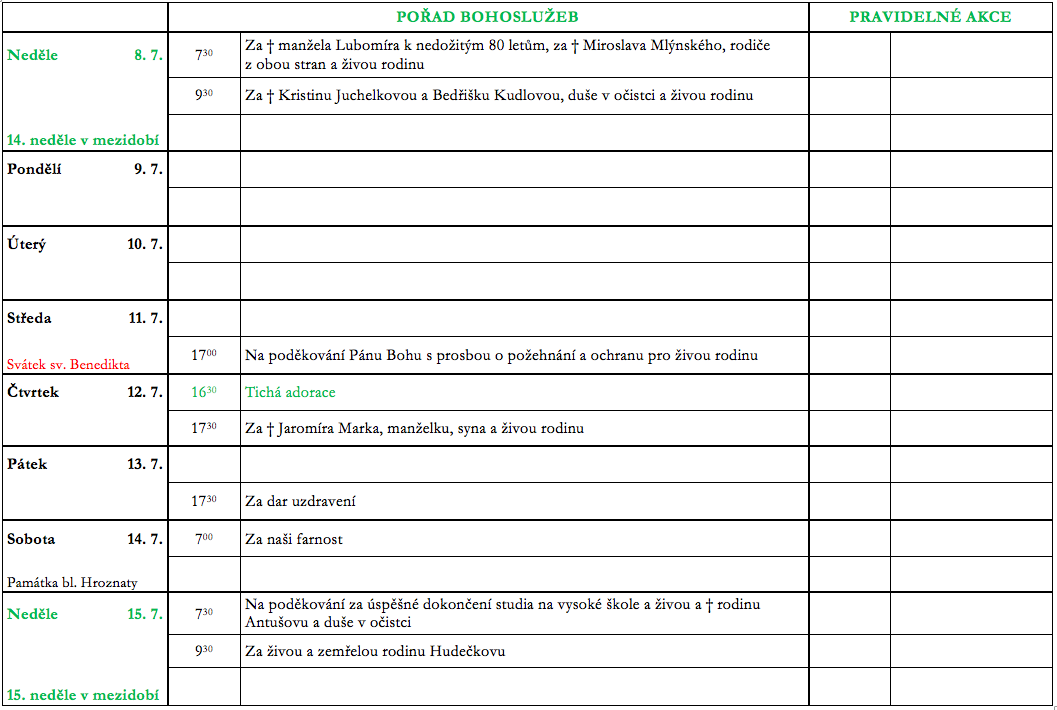 Aktuality k 8. červenci 2018 V neděli 8. července slavíme 14. neděli v mezidobí. Prohlédněte si pořad bohoslužeb a ohlášky. Previous postAktuality k 1. červenci 2018 Next postAktuality k 15. červenci 2018 Komentáře nejsou povoleny.