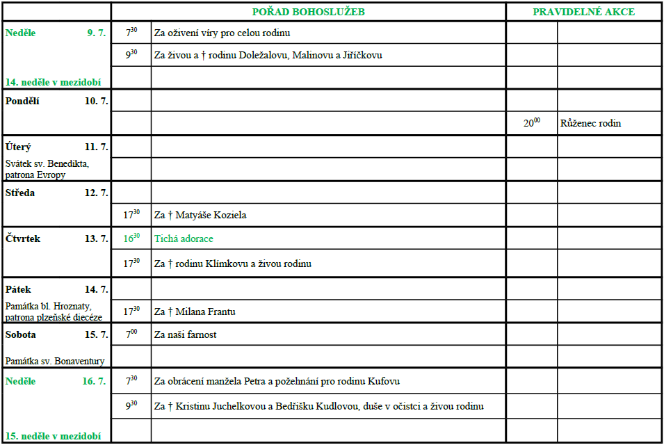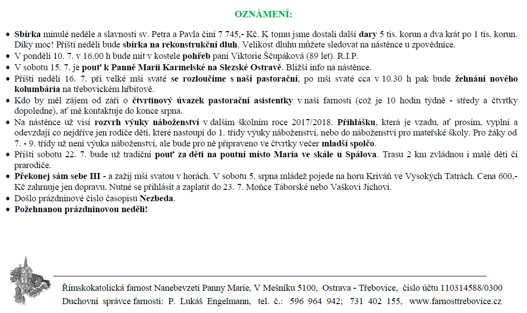 V neděli 9. července slavíme  14. neděli v mezidobí. Prohlédněte si pořad bohoslužeb a ohlášky.