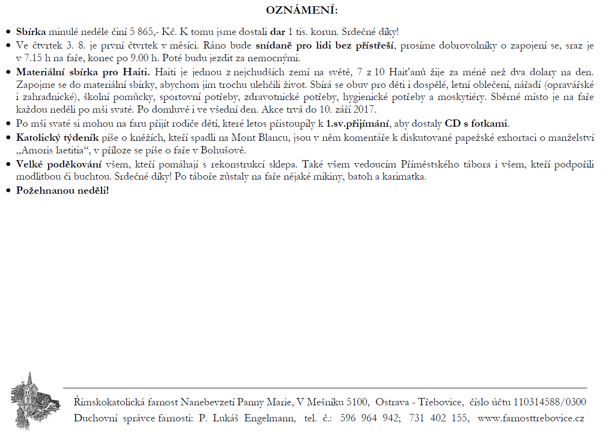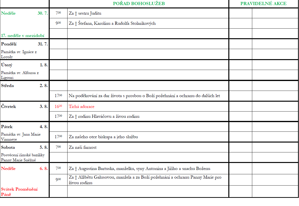 Ohlášky 17. neděle v mezidobí V neděli 30. července slavíme 17. neděli v mezidobí. Prohlédněte si pořad bohoslužeb a ohlášky. Previous postOhlášky 16. neděle v mezidobí Next postOhlášky svátku Proměnění Páně Komentáře nejsou povoleny.