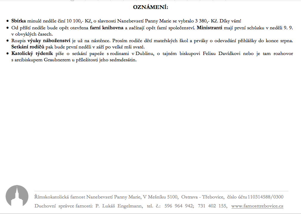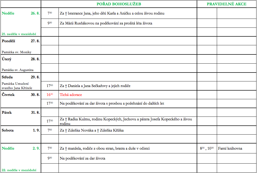 V neděli 26. srpna slavíme 21. neděli v mezidobí. Prohlédněte si pořad bohoslužeb a ohlášky.