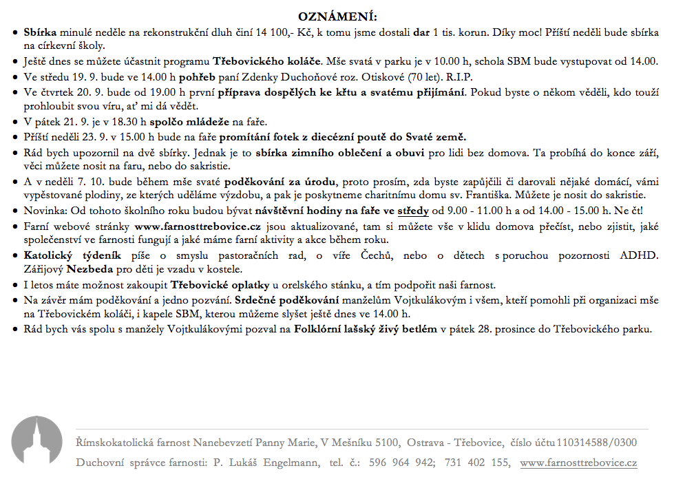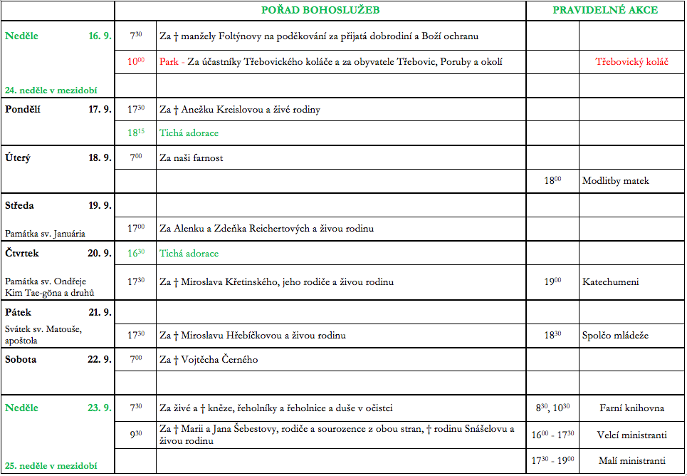 V neděli 16. září slavíme 24. neděli v mezidobí. Prohlédněte si pořad bohoslužeb a ohlášky.