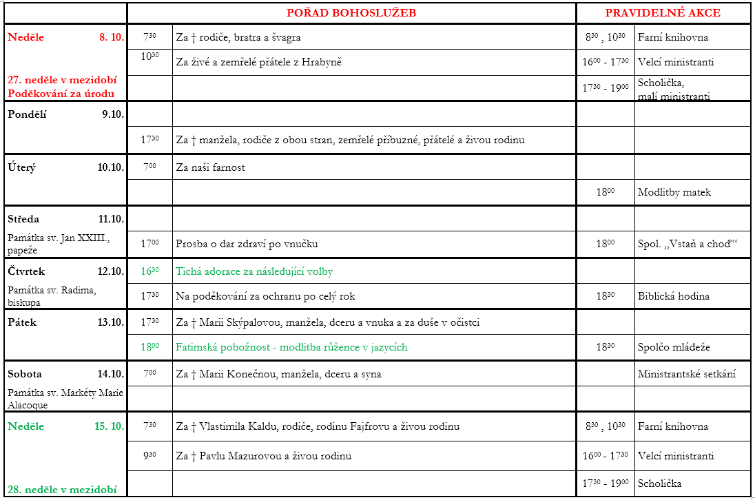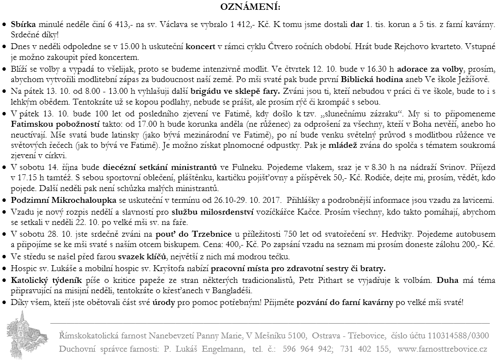 Ohlášky 27. neděle v mezidobí V neděli 8. října slavíme 27. neděli v mezidobí. Prohlédněte si pořad bohoslužeb a ohlášky. Previous postOhlášky 26. neděle v mezidobí Next postOhlášky 28. neděle v mezidobí Komentáře nejsou povoleny.