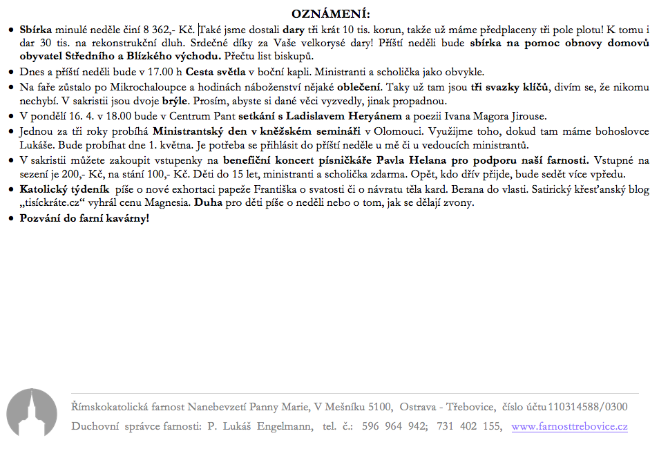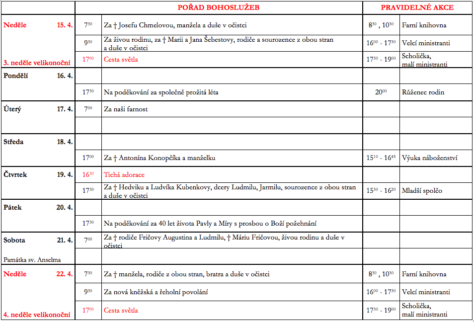 V neděli 15. dubna slavíme 3. neděli velikonoční. Prohlédněte si pořad bohoslužeb a ohlášky.