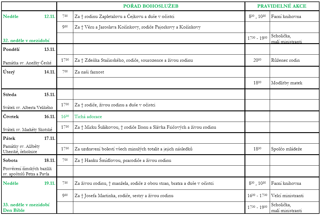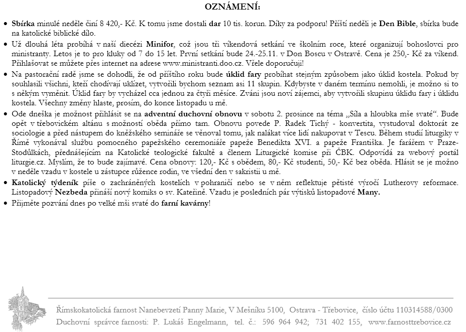Ohlášky 32. neděle v mezidobí V neděli 12. listopadu slavíme 32. neděli v mezidobí. Prohlédněte si pořad bohoslužeb a ohlášky. Previous postOhlášky 31. neděle v mezidobí Next postOhlášky 33. neděle v mezidobí Komentáře nejsou povoleny.