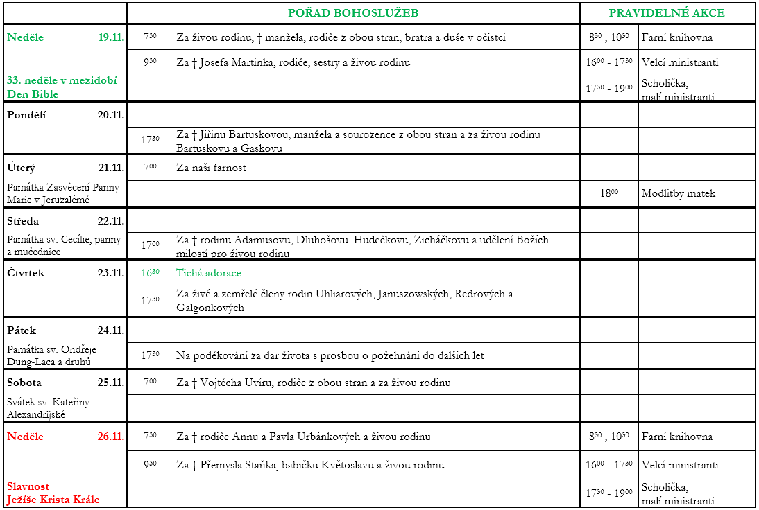 V neděli 19. listopadu slavíme  33. neděli v mezidobí. Prohlédněte si pořad bohoslužeb a ohlášky.