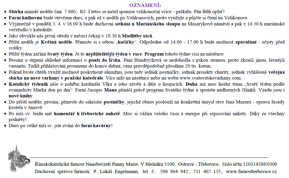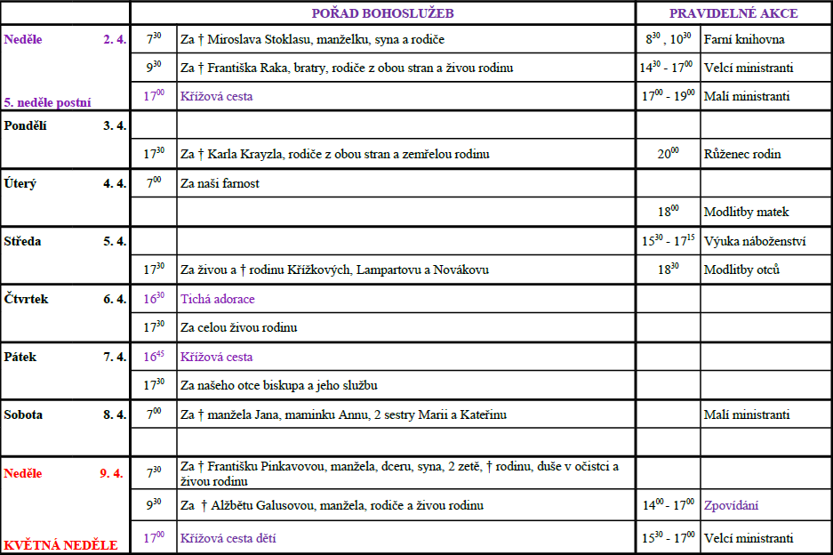 Ohlášky 5. neděle postní V neděli 2. dubna slavíme 5. neděli postní. Prohlédněte si pořad bohoslužeb a ohlášky. Previous postPřednáška „Přežila jsem gulag“ 30. 3. 2017 Next postSnídaně pro lidi bez přístřeší 6. 4. 2017 Komentáře nejsou povoleny.