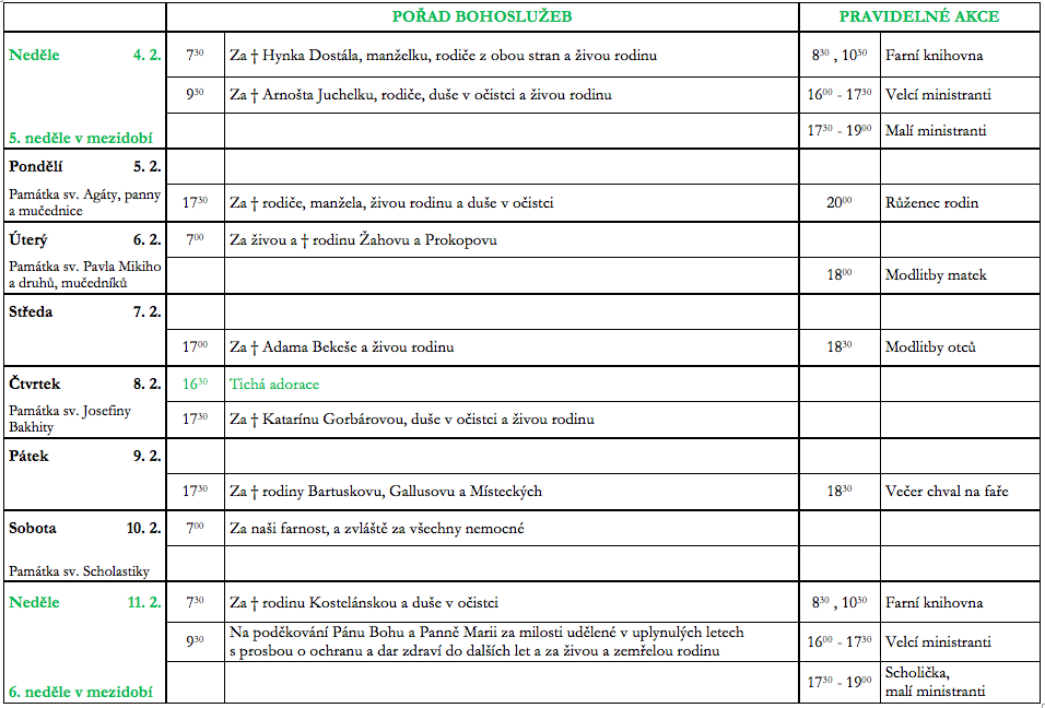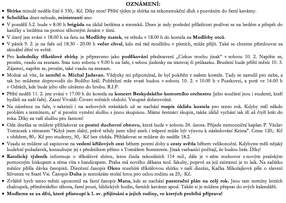 Ohlášky 5. neděle v mezidobí V neděli 4. února slavíme 5. neděli v mezidobí. Prohlédněte si pořad bohoslužeb a ohlášky. Previous postOhlášky 4. neděle v mezidobí Next postOhlášky 6. neděle v mezidobí Komentáře nejsou povoleny.