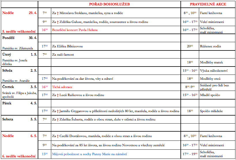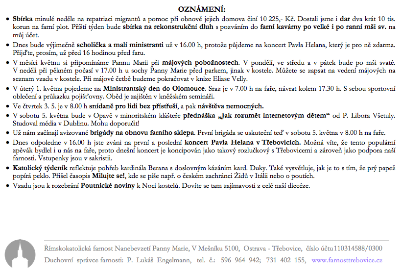 Ohlášky 5. neděle velikonoční V neděli 29. dubna slavíme 5. neděli velikonoční. Prohlédněte si pořad bohoslužeb a ohlášky. Previous postOhlášky 4. neděle velikonoční – neděle Dobrého Pastýře Next postOhlášky 6. neděle velikonoční Komentáře nejsou povoleny.