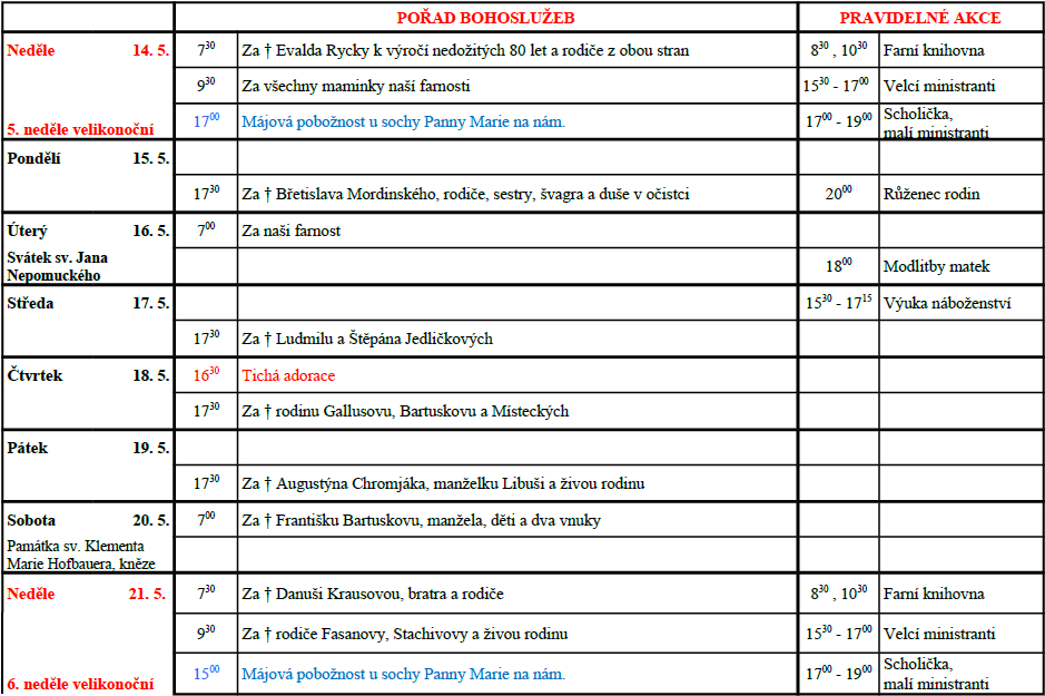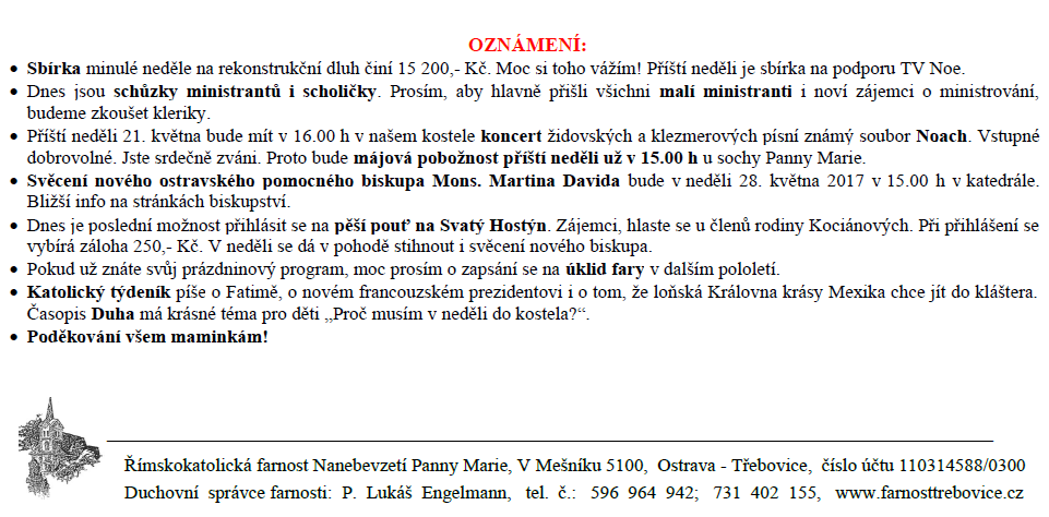 Ohlášky 5. neděle velikonoční V neděli 14. května slavíme 5. neděli velikonoční. Prohlédněte si pořad bohoslužeb a ohlášky. Previous postFatimská pobožnost v sobotu 13. 5. 2017 Next postOhlášky 6. neděle velikonoční Komentáře nejsou povoleny.