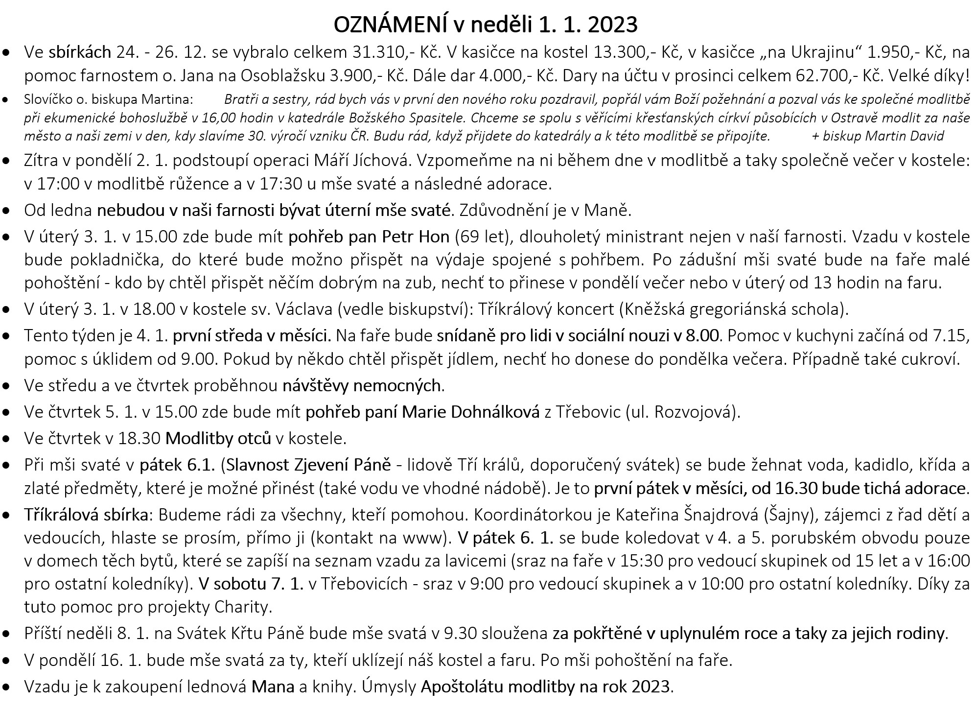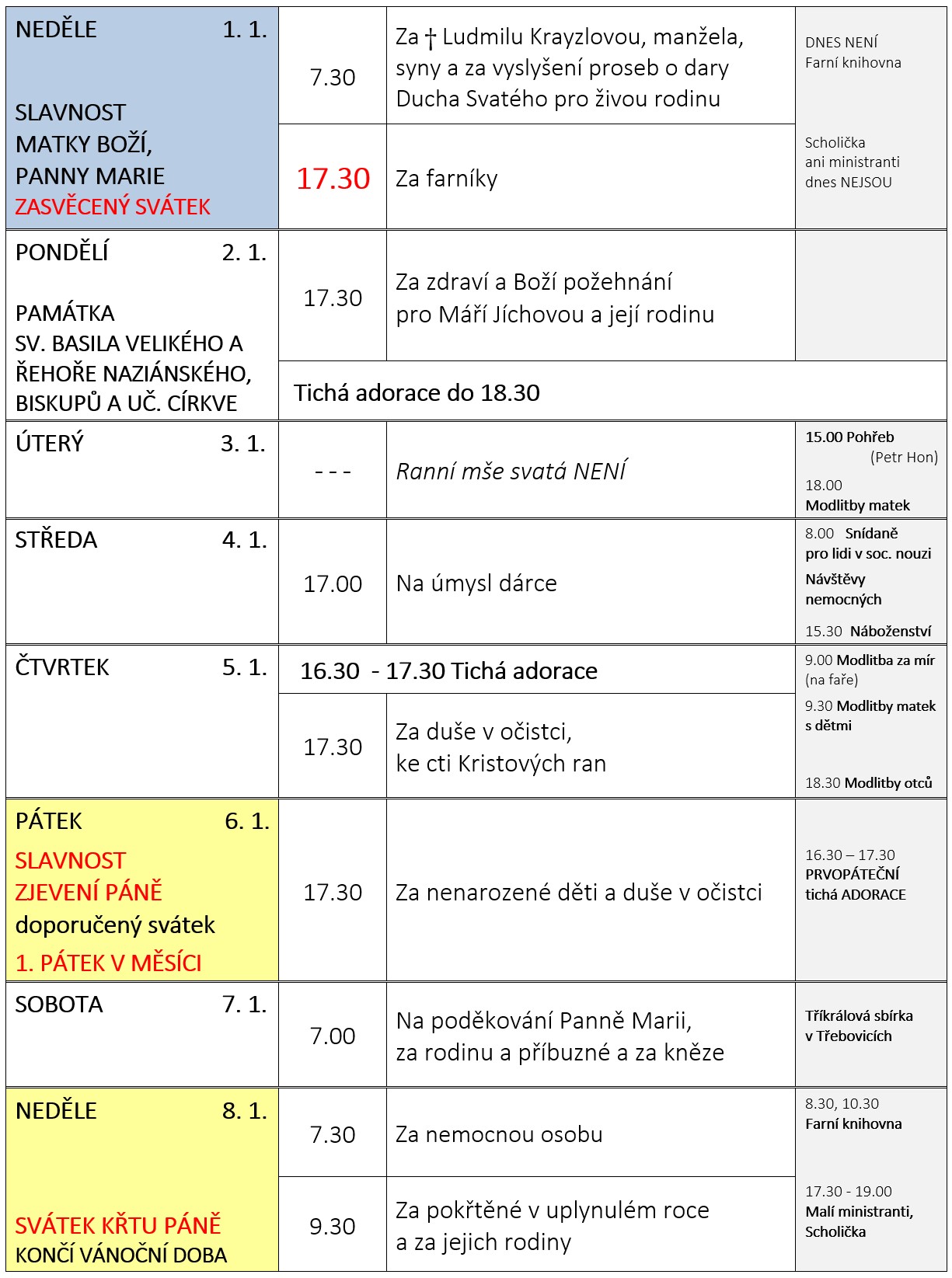 Ohlášky k 1. lednu V neděli 1. ledna slavíme SLAVNOST MATKY BOŽÍ, PANNY MARIE. Prohlédněte si pořad bohoslužeb a ohlášky. Previous postOhlášky k 25. prosinci Next postOhlášky k 8. lednu Komentáře nejsou povoleny.