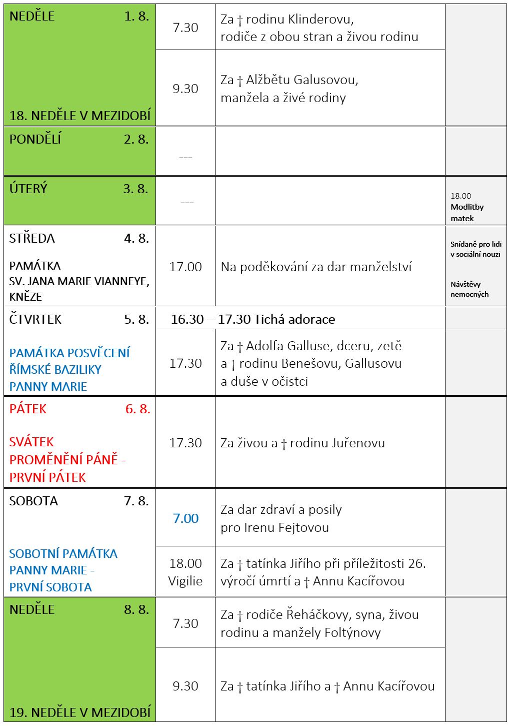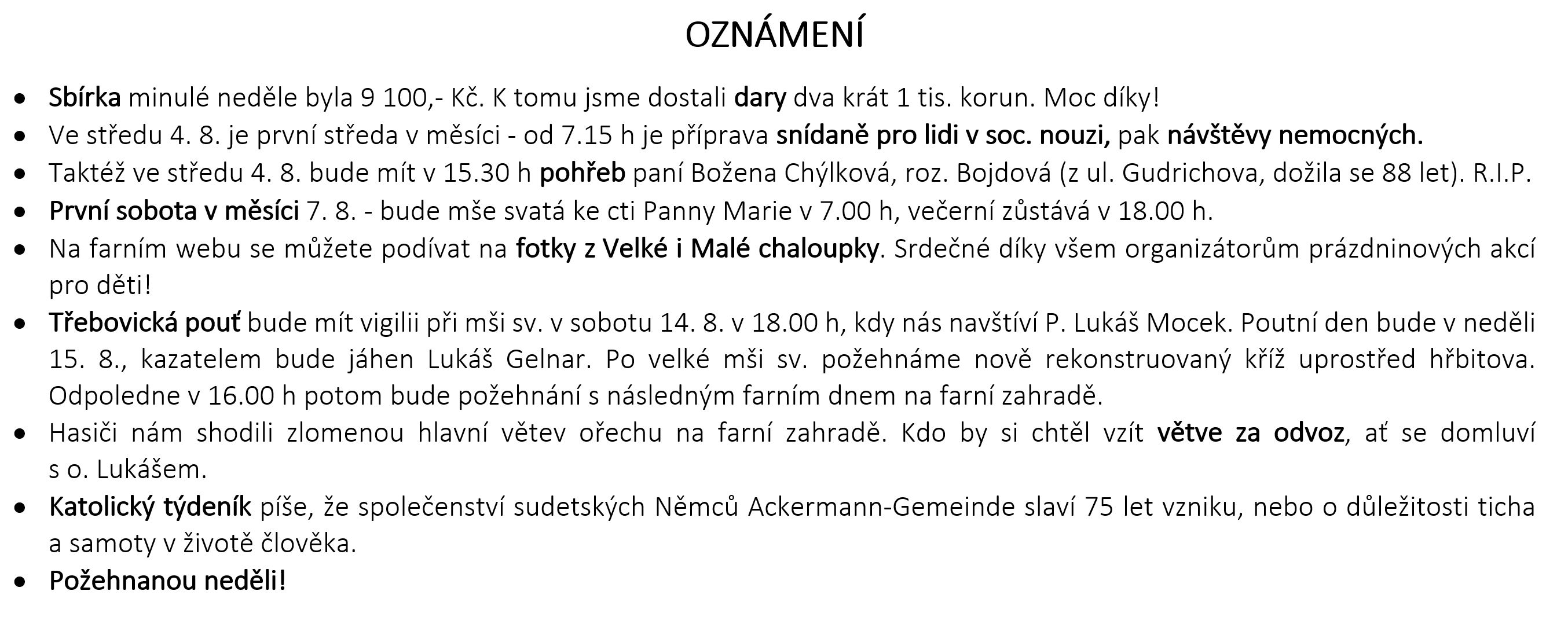 Ohlášky k 1. srpnu V neděli 1. srpna slavíme 18. neděli v mezidobí. Prohlédněte si pořad bohoslužeb a ohlášky. Previous postOhlášky k 25. červenci Next postOhlášky k 8. srpnu Komentáře nejsou povoleny.