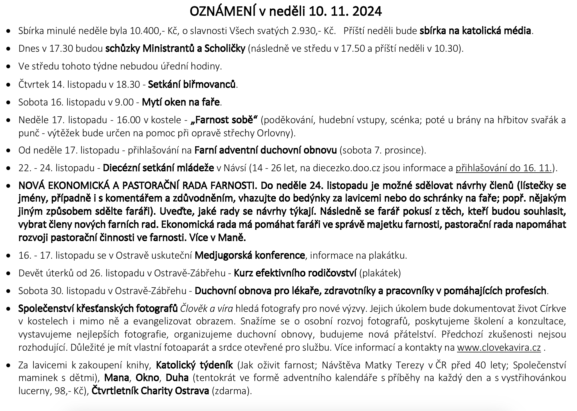 Ohlášky k 10. listopadu V neděli 10. listopadu slavíme 32. NEDĚLI V MEZIDOBÍ. Prohlédněte si pořad bohoslužeb a ohlášky: Previous postOhlášky k 3. listopadu Next postOhlášky k 17. listopadu Komentáře nejsou povoleny.