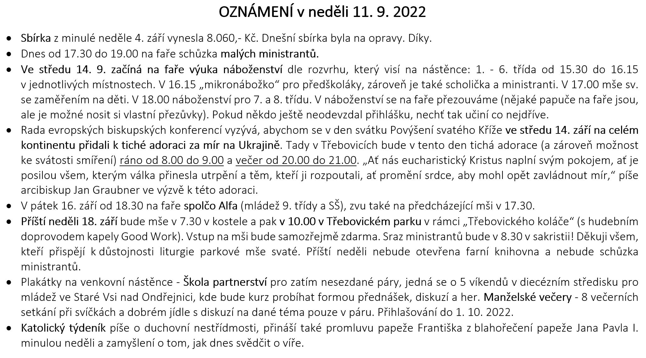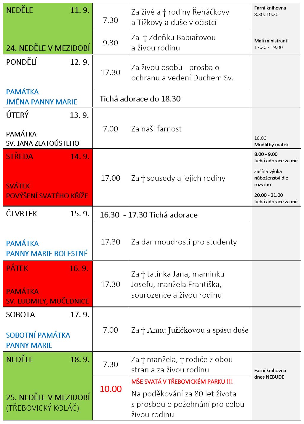 V neděli 11. září slavíme 24. NEDĚLI V MEZIDOBÍ. Prohlédněte si pořad bohoslužeb a ohlášky.