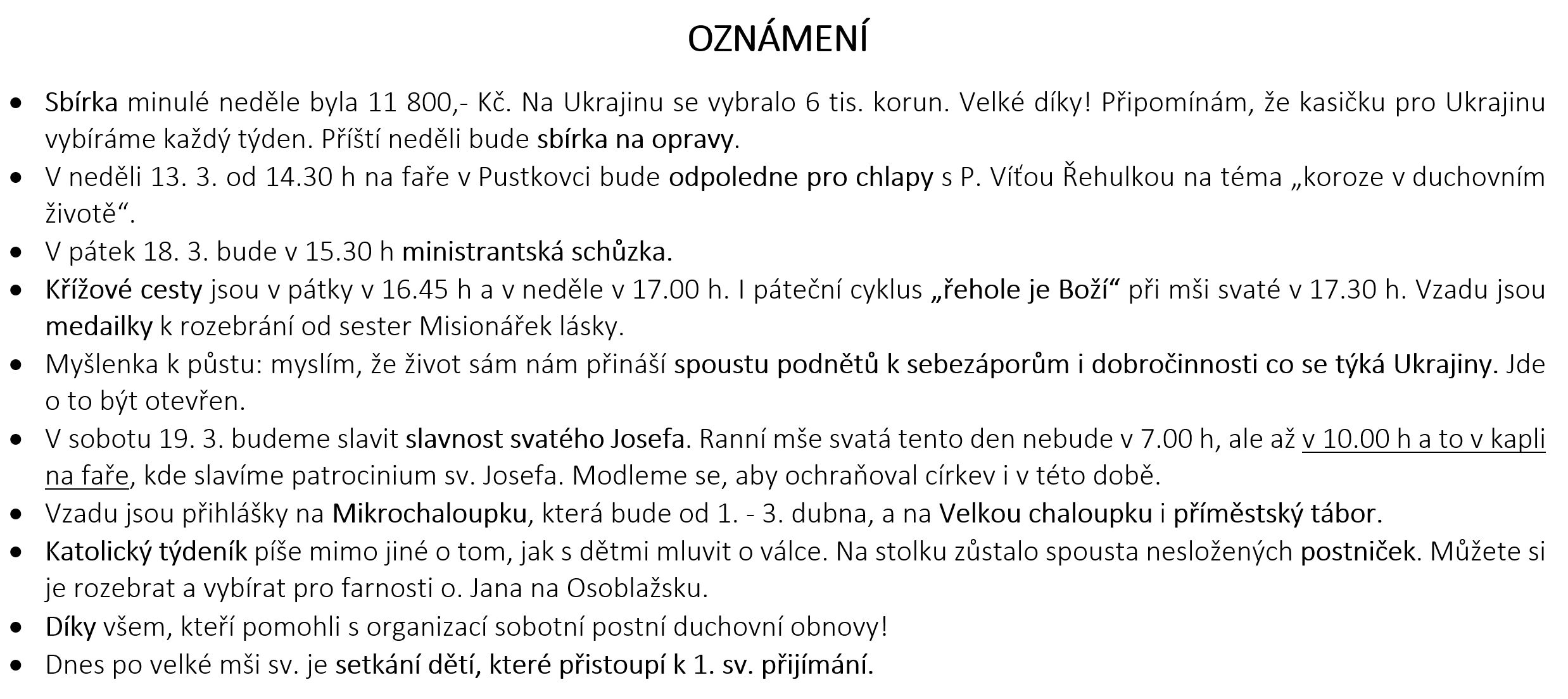 Ohlášky k 13. březnu V neděli 13. března slavíme 2. NEDĚLI POSTNÍ. Prohlédněte si pořad bohoslužeb a ohlášky. Previous postOhlášky k 6. březnu Next postOhlášky k 20. březnu Komentáře nejsou povoleny.