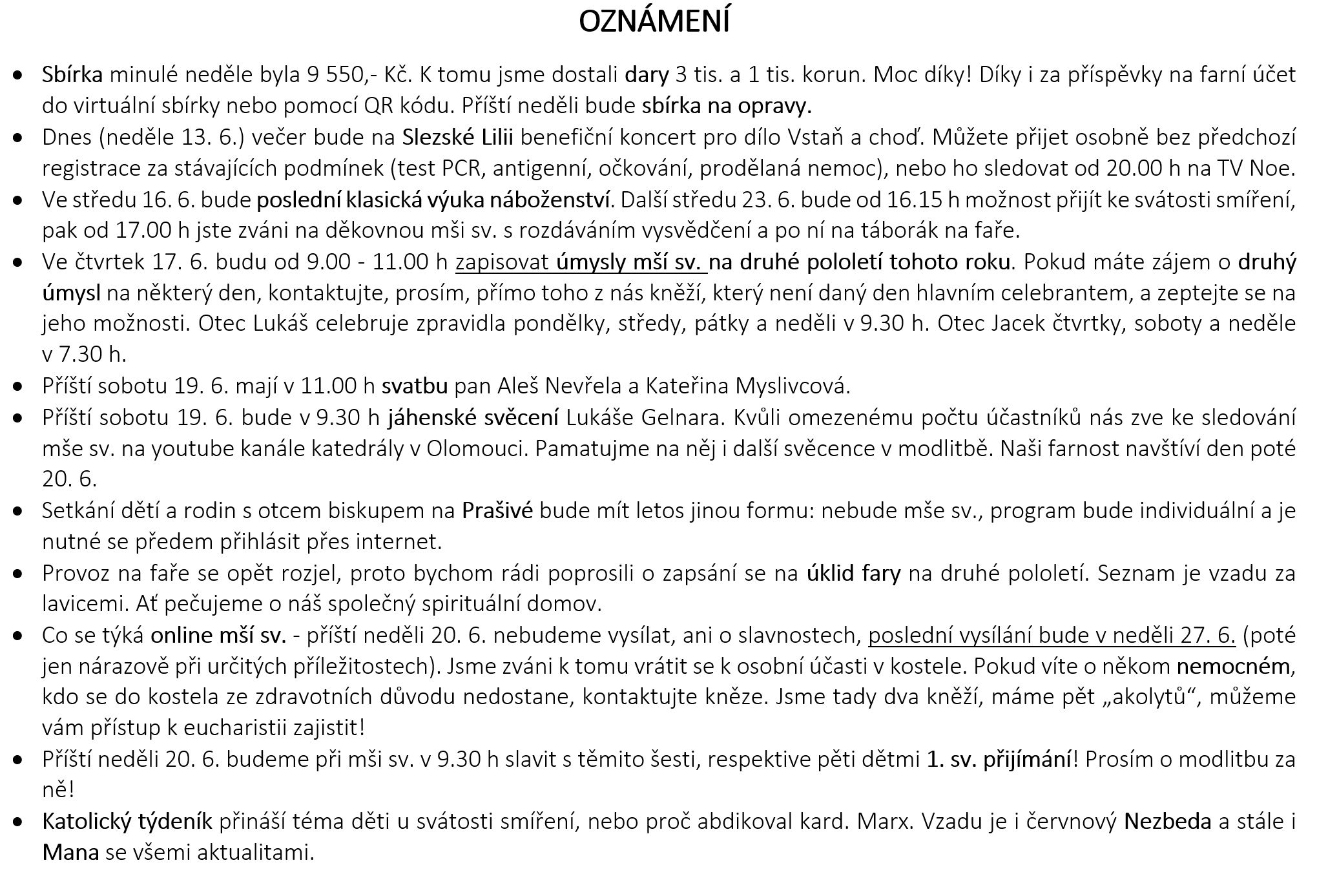Ohlášky k 13. červnu V neděli 13. června slavíme 11. neděli v mezidobí. Prohlédněte si pořad bohoslužeb a ohlášky. Previous postOhlášky k 6. červnu Next postOhlášky k 20. červnu Komentáře nejsou povoleny.