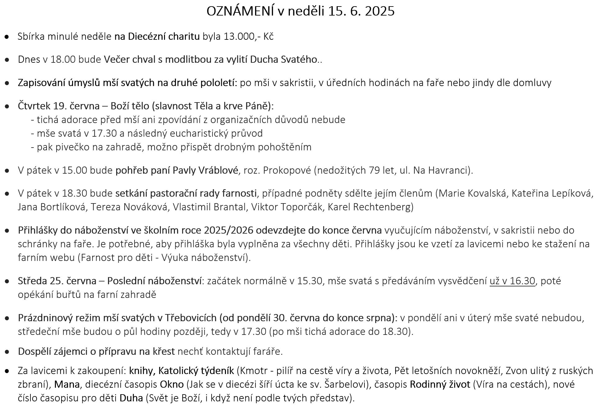 Ohlášky k 15. červnu V neděli 15. června slavíme SLAVNOST NEJSVĚTĚJŠÍ TROJICE. Prohlédněte si pořad bohoslužeb a ohlášky: Previous postOhlášky k 8. červnu Next postOhlášky k 22. červnu Komentáře nejsou povoleny.