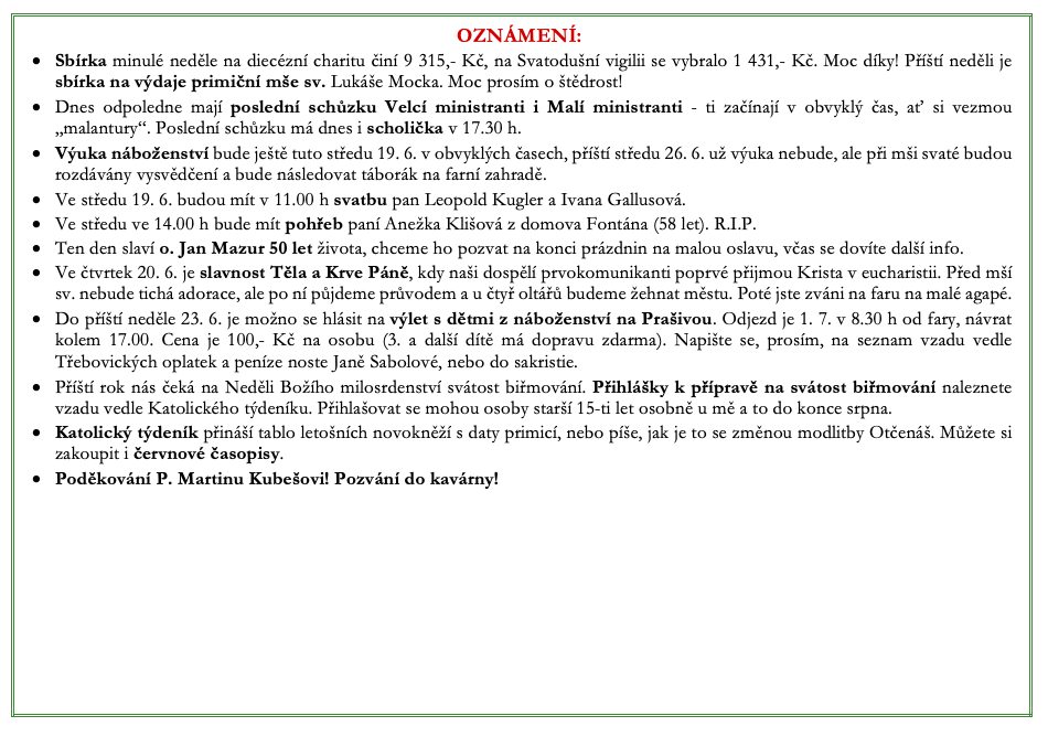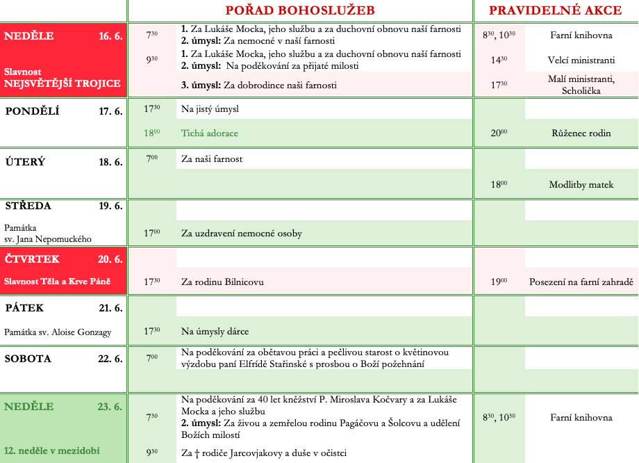Ohlášky k 16. červnu V neděli 16. června slavíme Slavnost Nejsvětější Trojice. Prohlédněte si pořad bohoslužeb a ohlášky. Previous postOhlášky k 9. červnu Next postOhlášky k 23. červnu Komentáře nejsou povoleny.