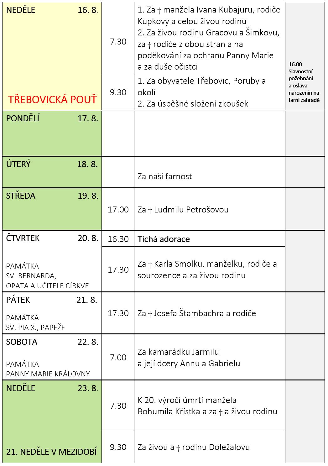 Ohlášky k 16. srpnu V neděli 16. srpna slavíme TŘEBOVICKOU POUŤ. Prohlédněte si pořad bohoslužeb a ohlášky. Previous postOhlášky k 9. srpnu Next postOhlášky k 23. srpnu Komentáře nejsou povoleny.
