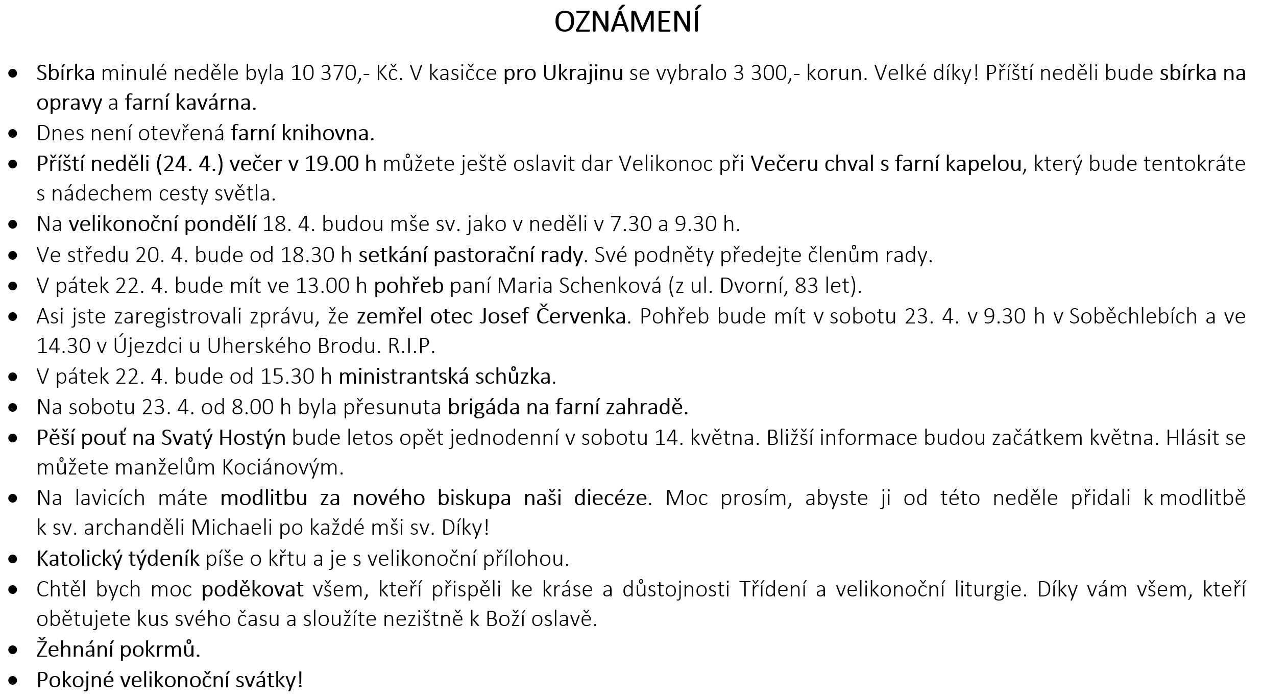 Ohlášky k 17. dubnu V neděli 17. dubna slavíme SLAVNOST ZMRTVÝCHVSTÁNÍ PÁNĚ. Prohlédněte si pořad bohoslužeb a ohlášky. Previous postOhlášky k 10. dubnu Next postOhlášky k 24. dubnu Komentáře nejsou povoleny.